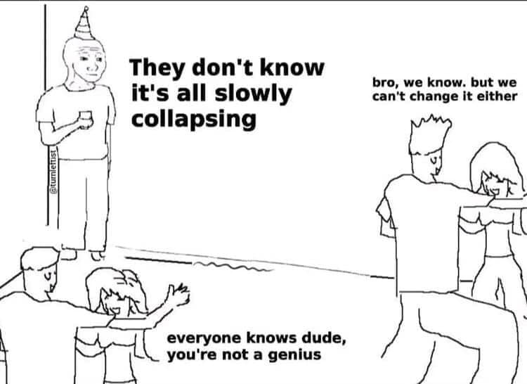 I have been doing freelance work, it is not mentally/creatively stimulating, but it is extremely well-paid, and leaves me much time to expend my creative energies on projects I am actually personally invested in (which I have been doing anyway, except now I’m not running a completely negative balance). As a side-effect of that work I get to listen to many actually reasonably interesting talks and discussions about social housing, and construction in the context of sustainability/the climate crisis, and it’s bleak. Which is nothing new to me I guess, but it’s maybe the first time that I see people professionally (rather than privately or politically) acknowledging it, while most people around me are gouging away on beef and flying around the globe as if there was no tomorrow. Sometimes I wonder what they are thinking, which always just makes me think of this: